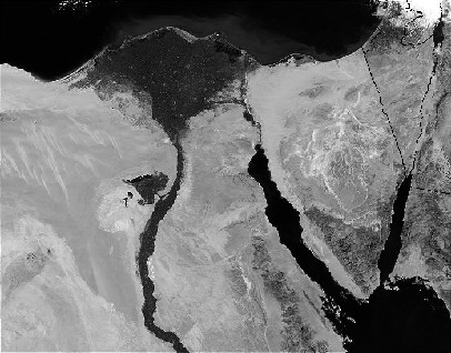 Figura 2.1. Foto del norte de Egipto. La desembocadura del Nilo se parece a la letra griega ‘delta’ mayúscula (∆), de donde viene nuestra palabra delta. De la palabra egipcia deseret procede nuestro desierto; de su wh’t procede nuestro oasis; y de su fértil ‘tierra negra’ Kemit, nuestra química y, por tanto, nuestra al-quimia.