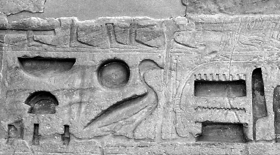 Figura 2.2. Entre los jeroglíficos de un faraón que es ‘señor de las apariciones’ (izquierda) y ‘amado de Amón’ (derecha) se ve un patito con un sol, indicando que además era Sa-Ra, ‘hijo de Ra’, de donde quizá viene nuestra Sara.