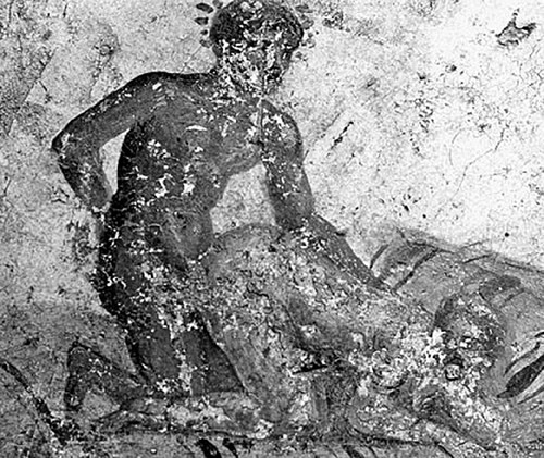 Figura 1.1: Pintura mural de Pompeya que muestra a una mujer culibonia ofreciendo su culo durante el acto sexual. Culibonia era una de las más de sesenta palabras que tenían los romanos para decir ‘puta’, y su significado es más que evidente: se compone de culus (‘culo’) y bonus (‘bueno’). O sea, que tiene un ‘culo bueno’. Del latín culus proceden otras muchas palabras nuestras, como culón y culito, culero y culote, culillo y culata, recular y encular.