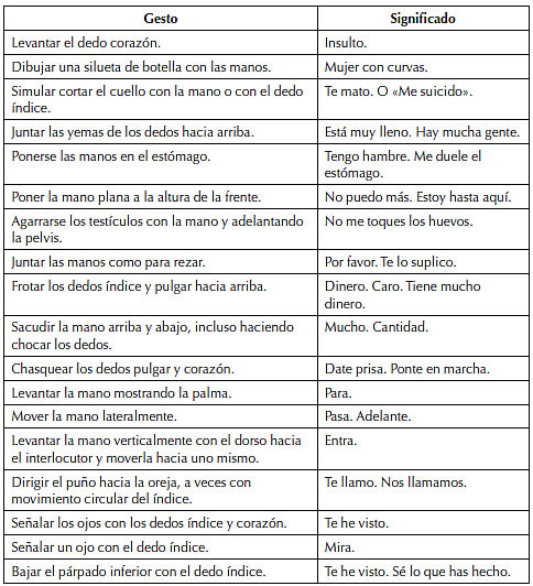 Y muchos de estos gestos son compartidos por la mayoría de culturas. Aunque hay algunos específicos para cada sociedad: por ejemplo, para indicar «suicidio», en Europa y Norteamérica se apunta con el dedo índice en la sien, mientras en Japón se simula el gesto del harakiri.