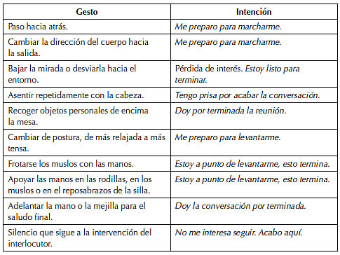 Cuando queremos iniciar una acción pero algo nos retiene, realizamos unos movimientos (más o menos visibles) llamados indicadores de intención. Uno de los indicadores más utilizados es el de prepararse para levantarse y salir. Cuando alguien quiere levantarse y cerrar una conversación, podemos observar que se mueve en la silla y se inclina hacia delante. Además puede apretar las manos sobre las rodillas, apoyarse en la base del asiento o el reposabrazos para coger impulso y levantarse, apoyar una mano en un muslo y adelantar el tronco, o dar una palmada con las dos manos en los muslos, como indicación de final de la conversación.