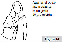 • El escudo del objeto. Con las dos manos a la altura del estómago, sostengo unos papeles, una taza, un libro que protegen mi espacio personal e impiden a mi interlocutor avanzar más. También los bolsos son buenos aliados a la hora de proteger el tronco. Un bolso en bandolera permite dejar una mano en la tira que nos cruza el pecho. Está en posición próxima al corazón y lista para cubrir el pecho. Si el bolso lo llevamos colgando del hombro también lo agarramos fuerte incluso empujando el asa hacia delante.