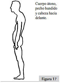 Cabeza desplazada hacia delante. Esta posición está presente cuando hay cansancio, desgana, poca implicación en lo que se hace o se dice. Con frecuencia esta postura es característica en una persona y forma parte de sus hábitos posturales. Es imposible mantener esta posición de la cabeza si el tronco está abierto y la columna bien vertical, por lo que va asociada a un cuerpo cerrado y átono. El efecto es que la cabeza cuelga hacia adelante aunque se mantenga la mirada al frente.