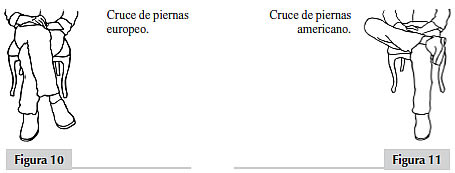 En primer lugar debemos distinguir el cruce «americano» del cruce «europeo». El cruce americano se realiza apoyando un tobillo encima del muslo opuesto. Las mujeres solo lo realizan cuando visten pantalón y en situaciones muy informales, pues la abertura de muslos no está aceptada socialmente en situaciones formales. En cuanto al sentido del cruce, no observamos una preferencia para cruzar hacia un lado o hacia otro, sino que esta elección inconsciente la realizamos en función de la relación que establecemos con el otro.