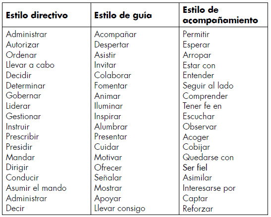 En el centro encontramos el estilo de guía. Imagine que viaja a un país extranjero y contrata a un guía para que lo ayude. El trabajo del guía no consiste en decirle cuándo debe llegar, adónde debe ir o qué debe ver o hacer. Un buen guía tampoco se limita a seguirle donde quiera que vaya. Un guía hábil sabe escuchar y ofrece información experta cuando es necesario. La EM se sitúa en este territorio intermedio entre dirigir y acompañar e incluye elementos de ambos. Ayudar a un niño a aprender una tarea nueva exige guiarlo: ni hacer demasiado ni demasiado poco para ayudarle. En el recuadro 1.2 encontrará algunos verbos asociados a cada uno de los tres estilos comunicativos y que se dan de forma natural en la vida cotidiana.