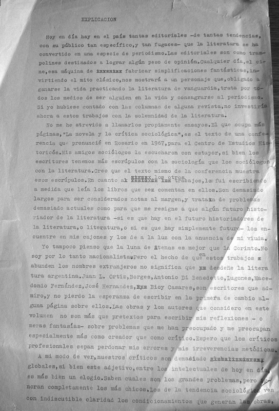 A mi modo de ver, nuestros críticos son demasiado globales, si bien este adjetivo, entre los intelectuales de hoy en día, es más bien un elogio. Saben cuáles son los grandes problemas, pero ignoran completamente los más chicos. Los de tendencia sociológica ven con indiscutible claridad los condicionamientos que generan las obras, pero a las obras concretas o bien las eluden o bien se vuelven dogmáticos en sus análisis. En cuanto a los otros, no me parece muy descortés de mi parte afirmar que permanecen en el limbo de «los problemas eternos», limbo en el que pululan la ideología reaccionaria y las prebendas. Pienso que en las actuales condiciones históricas, y sobre todo en este continente, no está tan fuera de lugar la posibilidad de poner la literatura entre paréntesis. Y como son necesarios el tiempo y el reconocimiento de los demás para que los esfuerzos de un hombre se conviertan en literatura, sería muy pretencioso de mi parte aspirar a que estos trabajos sean tomados en consideración, aunque más no sea para ser puestos entre paréntesis. Pero, desgraciadamente, soy incapaz de hacer cualquier otra cosa que no sea literatura. Empresas más elevadas despiertan a veces mi entusiasmo sin que eso exceda —y nada más que por unos momentos— los límites de mi imaginación. Un amigo mío sabe comentar que, debido a las condiciones que reinan en este país, muchos hombres han visto frustrada su íntima vocación de torneros mecánicos y no han tenido más remedio que dedicarse a la poesía. Yo no padezco ni esa frustración.