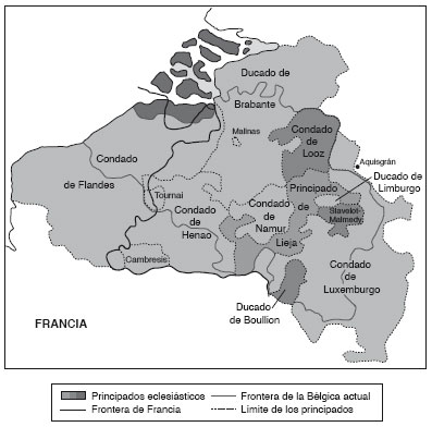 Sobre el futuro territorio de Bélgica se desarrollaron entonces espacios casi independientes, como los condados (fig. 3). Ejemplos fueron el de Brabante, el de Limburgo, el de Luxemburgo y el de Namur. También formaba parte de este grupo el principado de Lieja, así como el condado de Flandes, una entidad feudal fundada en el año 892 como dependencia del reino de Francia, aunque en la práctica escapó a la autoridad del rey de Francia.