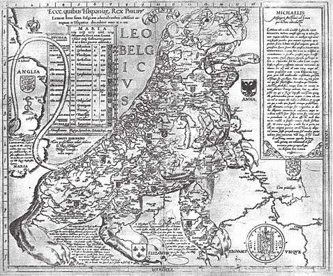El nombre «Bélgica» de la provincia romana permaneció, como se ha dicho, casi doce siglos en el olvido. Y cuando reapareció, lo hizo en un mapa que tuvo mucho éxito en el siglo XVI, el Leo Belgicus, de 1583 (fig. 6). Fue dibujado por primera vez por el cartógrafo austriaco Michael Aitzinger, y en él se aprecia una forma de león en la que se incluyen enteros los Países Bajos de la época, entonces en plena guerra de los Ochenta Años.