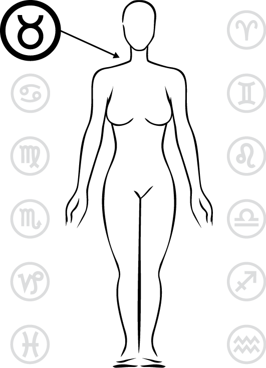 El toro es un bovino de apariencia distintiva, notable por su cuerpo grande (puede llegar a pesar unos mil kilos) y un cuello también grande. El cuello del toro es una zona tan prominente que en la jerga médica se emplea la expresión «cuello de toro» para referirse a una persona cuyo cuello está agrandado (normalmente debido a hipertrofia de los músculos o a la hinchazón de los ganglios linfáticos). Dada la relación entre el toro y su cuello, no es de sorprender que el cuello sea la zona corporal relacionada con el Toro del zodiaco, Tauro.